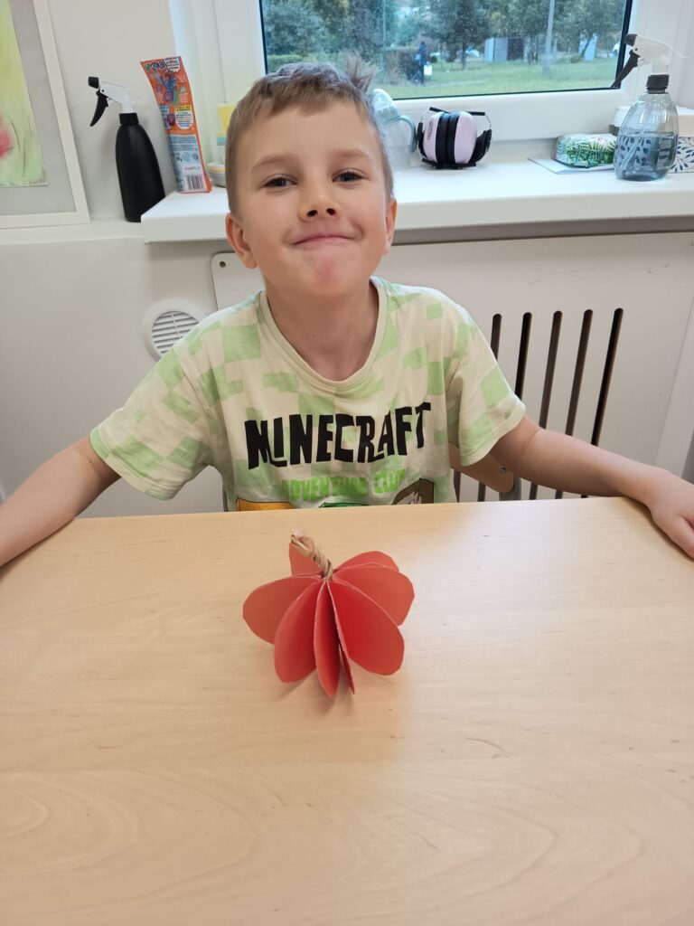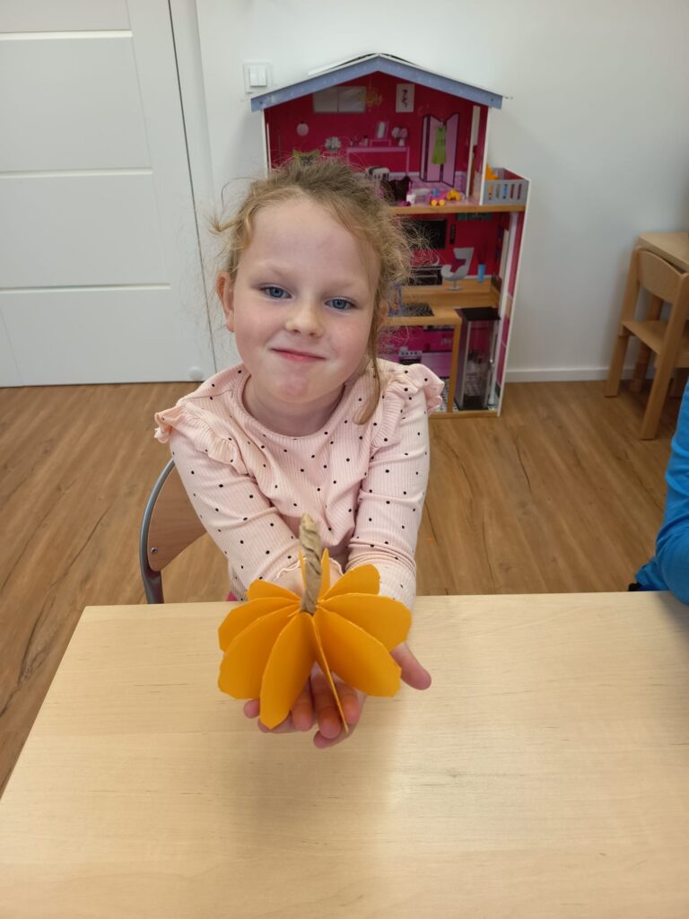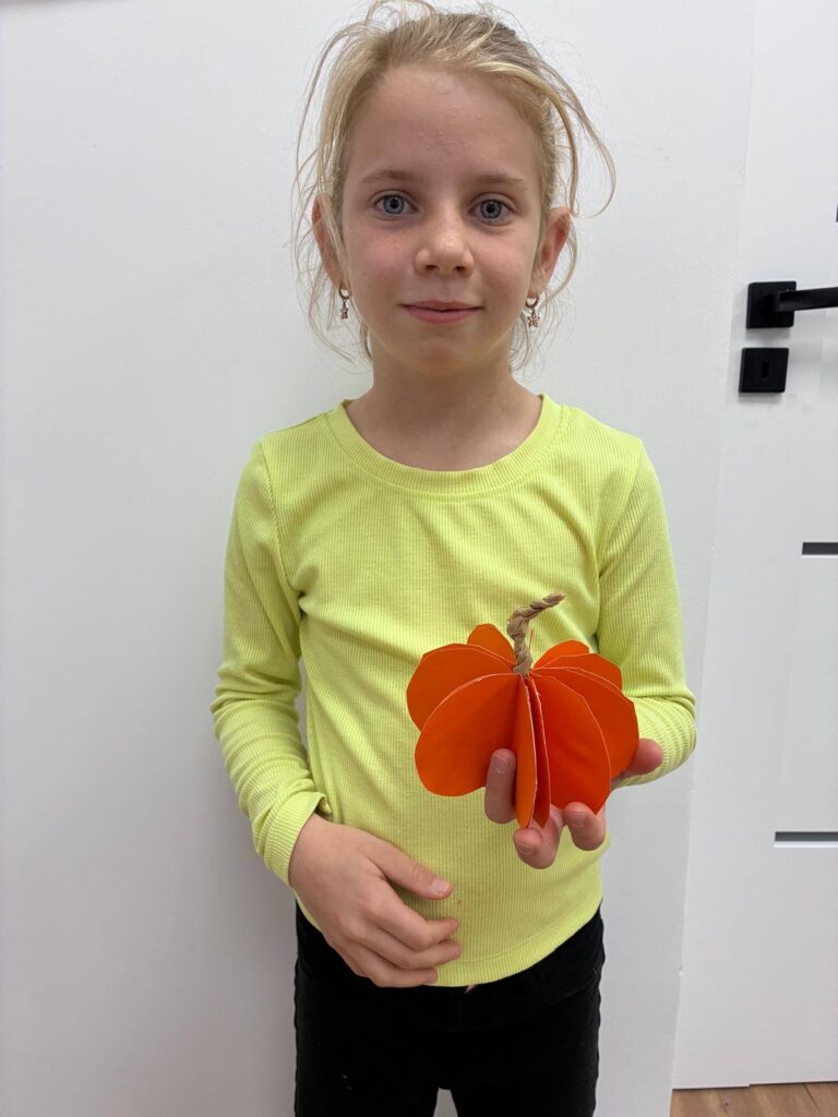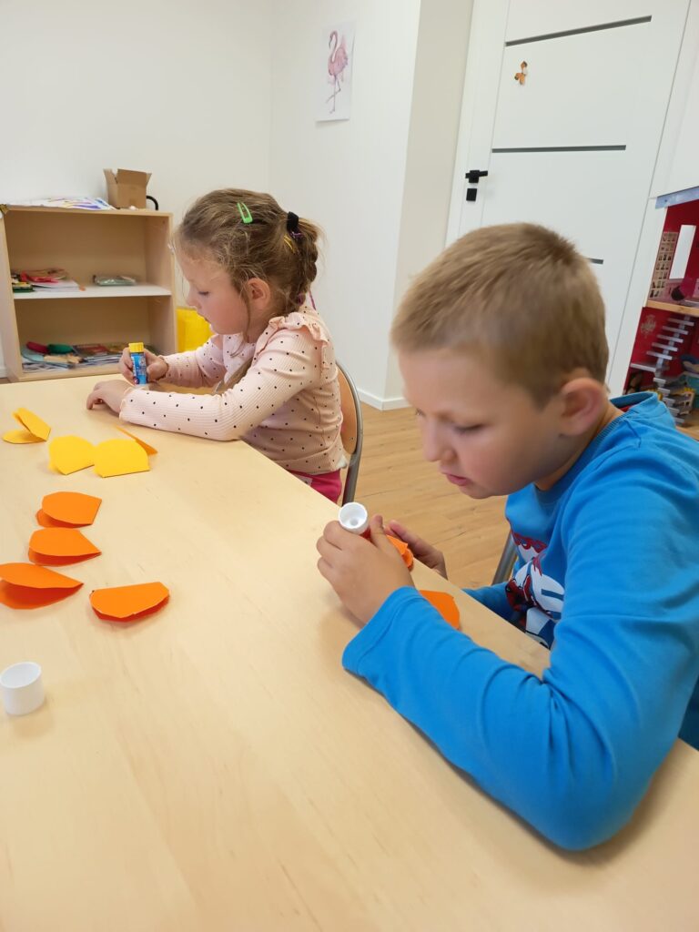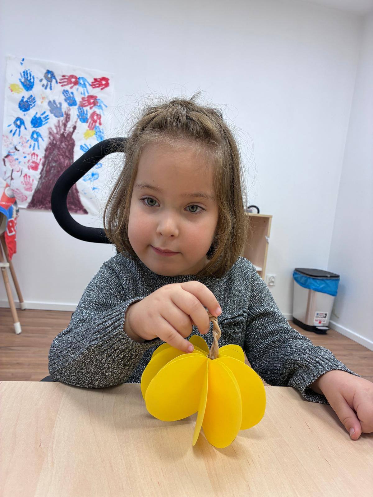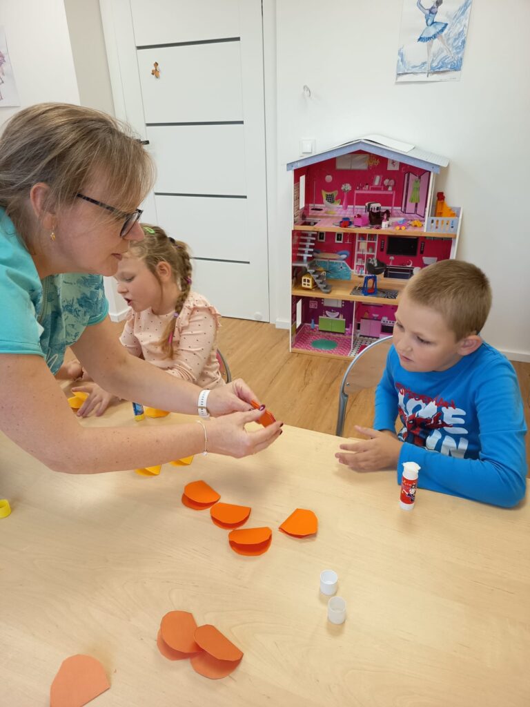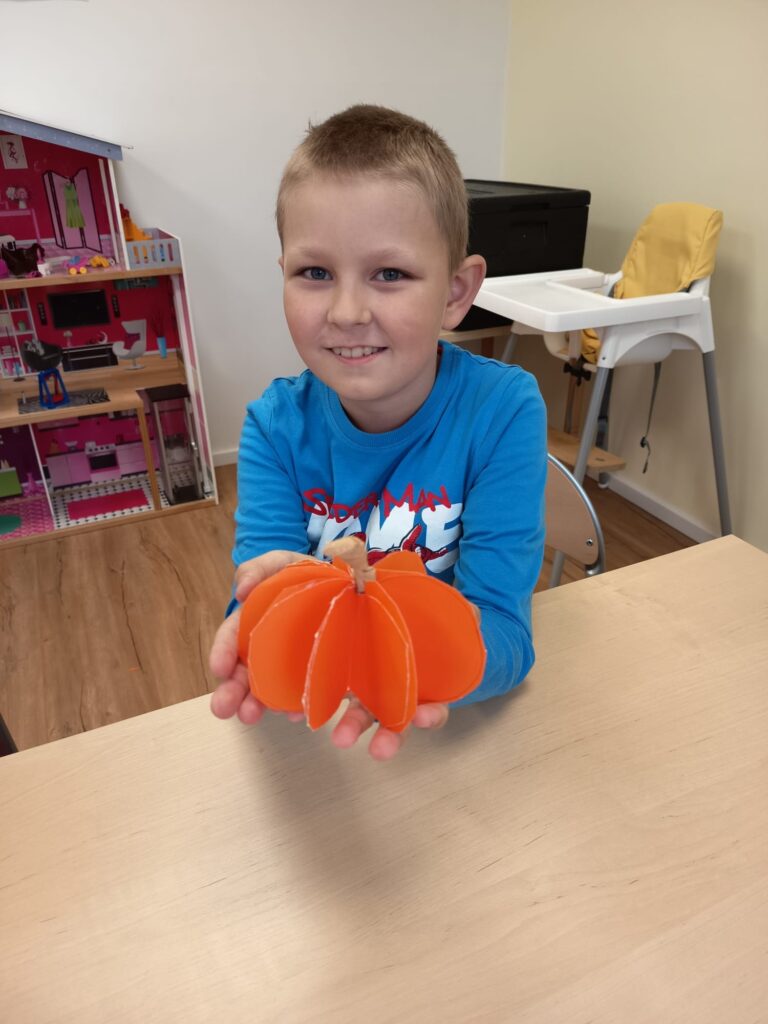 Październik, jesienne dynie – arteterapia. Dzieci wycinały, składały, sklejały – w wielkim skupieniu powstały dynie w kolorach jesieni.