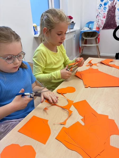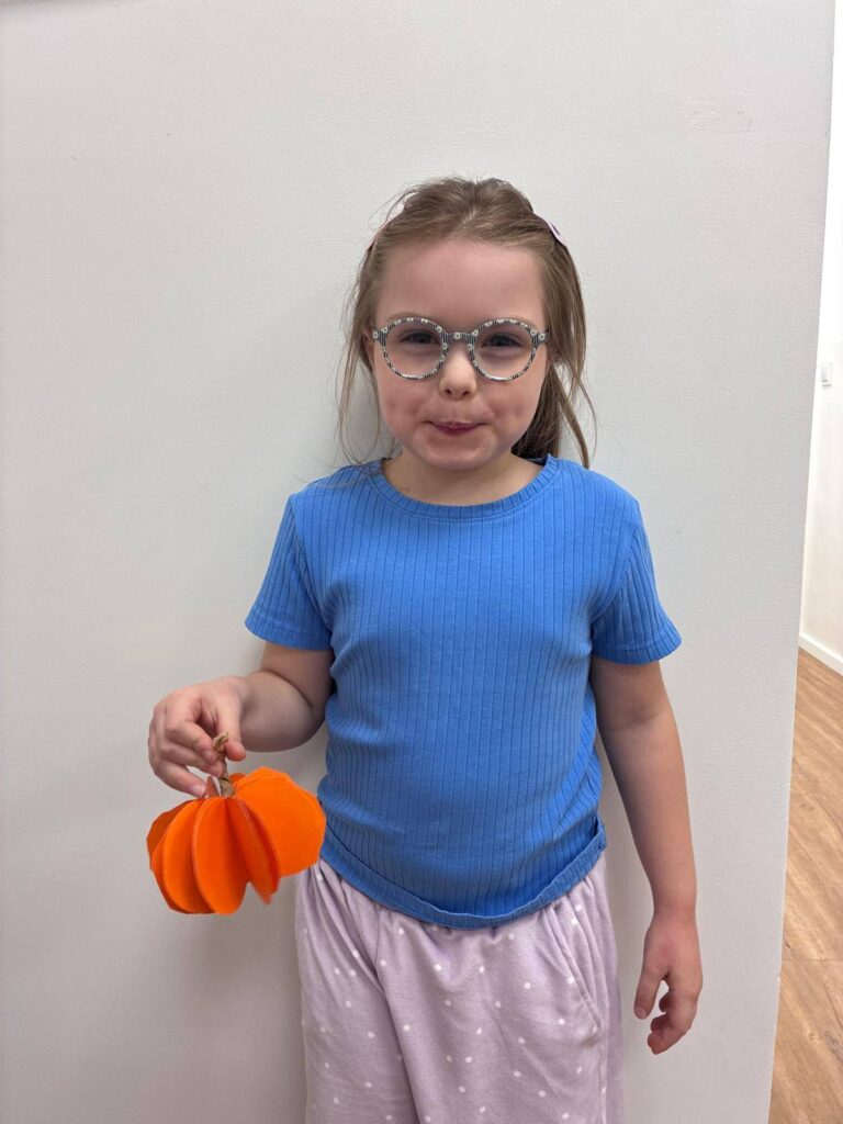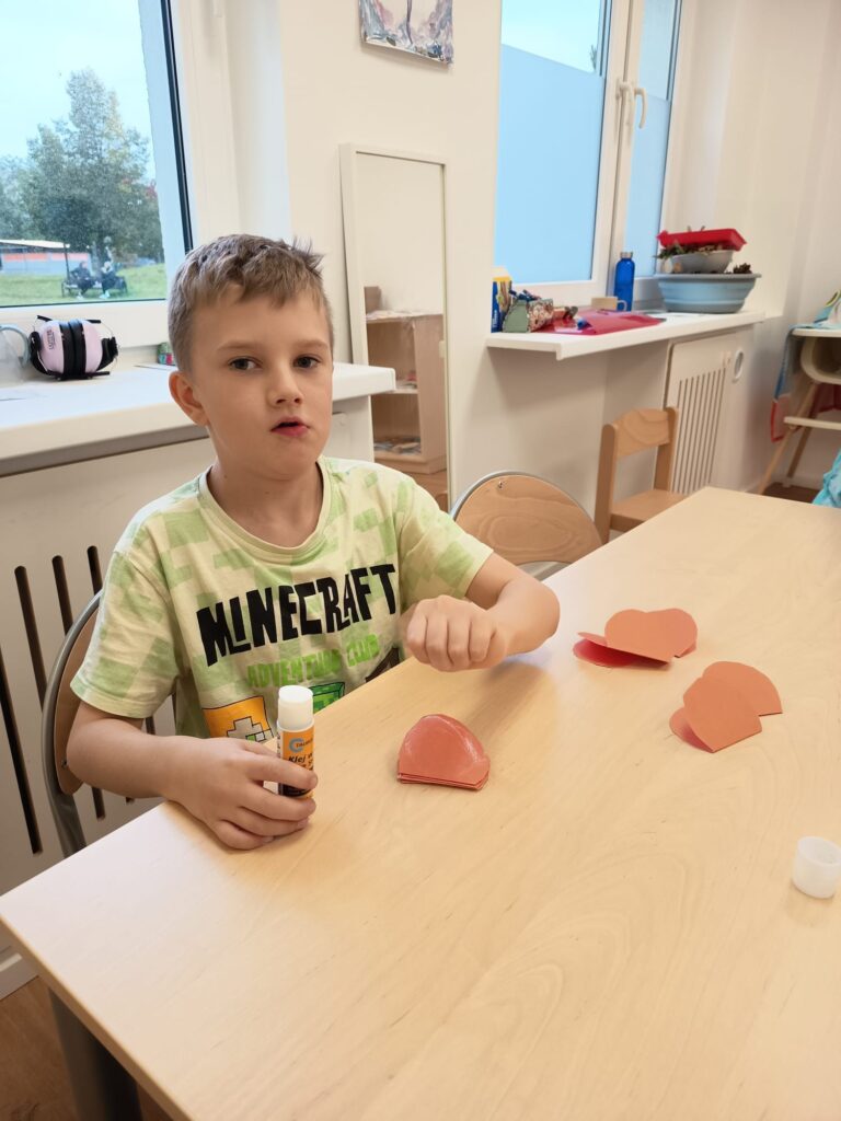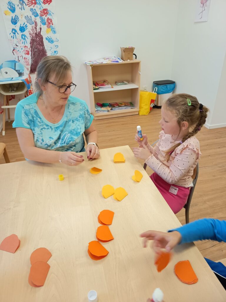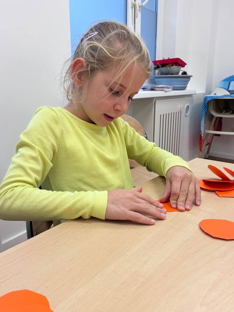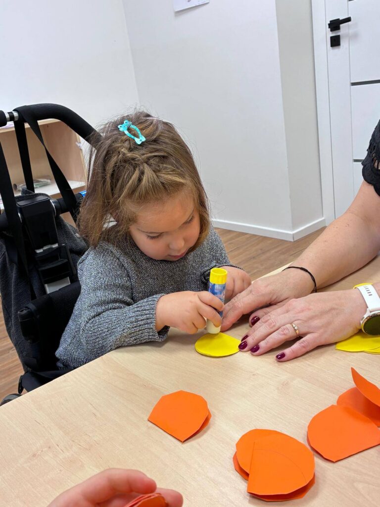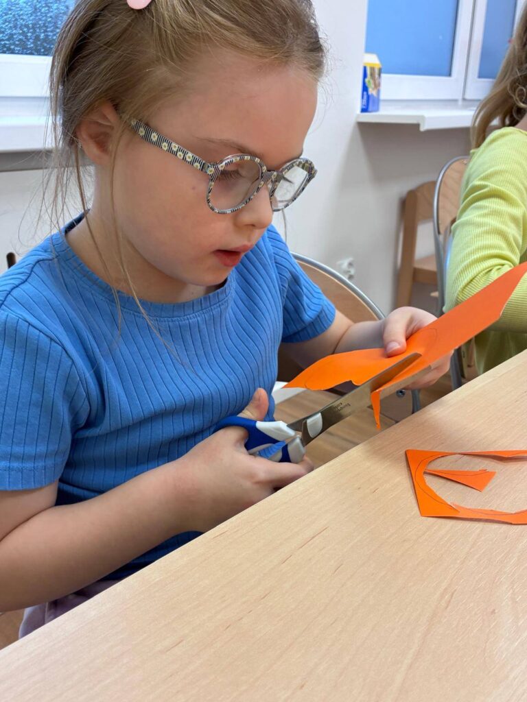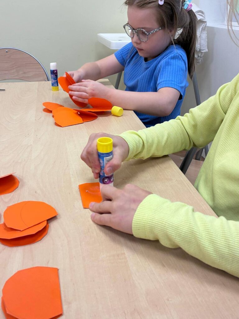 Październik, jesienne dynie – arteterapia. Dzieci wycinały, składały, sklejały – w wielkim skupieniu powstały dynie w kolorach jesieni.