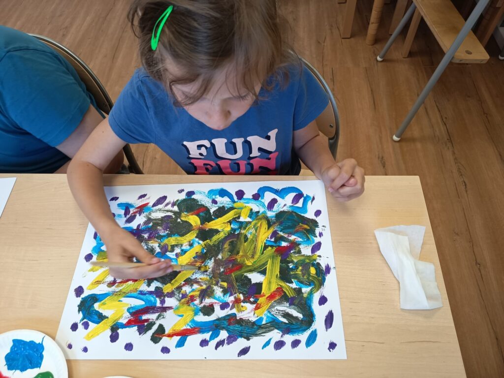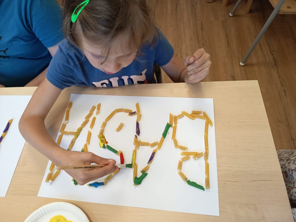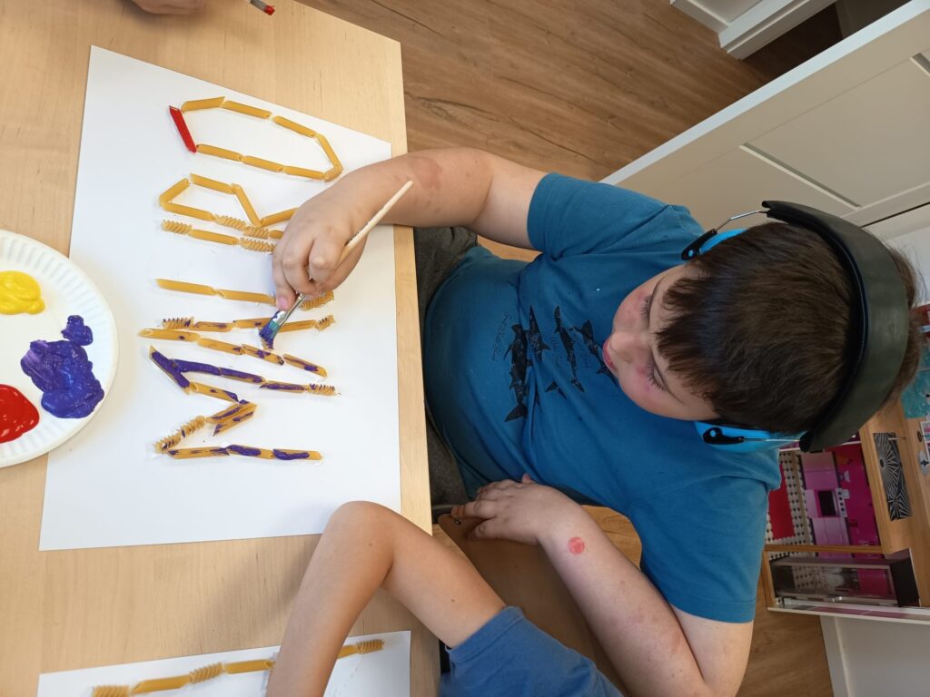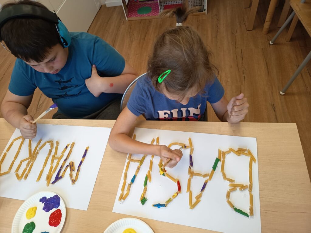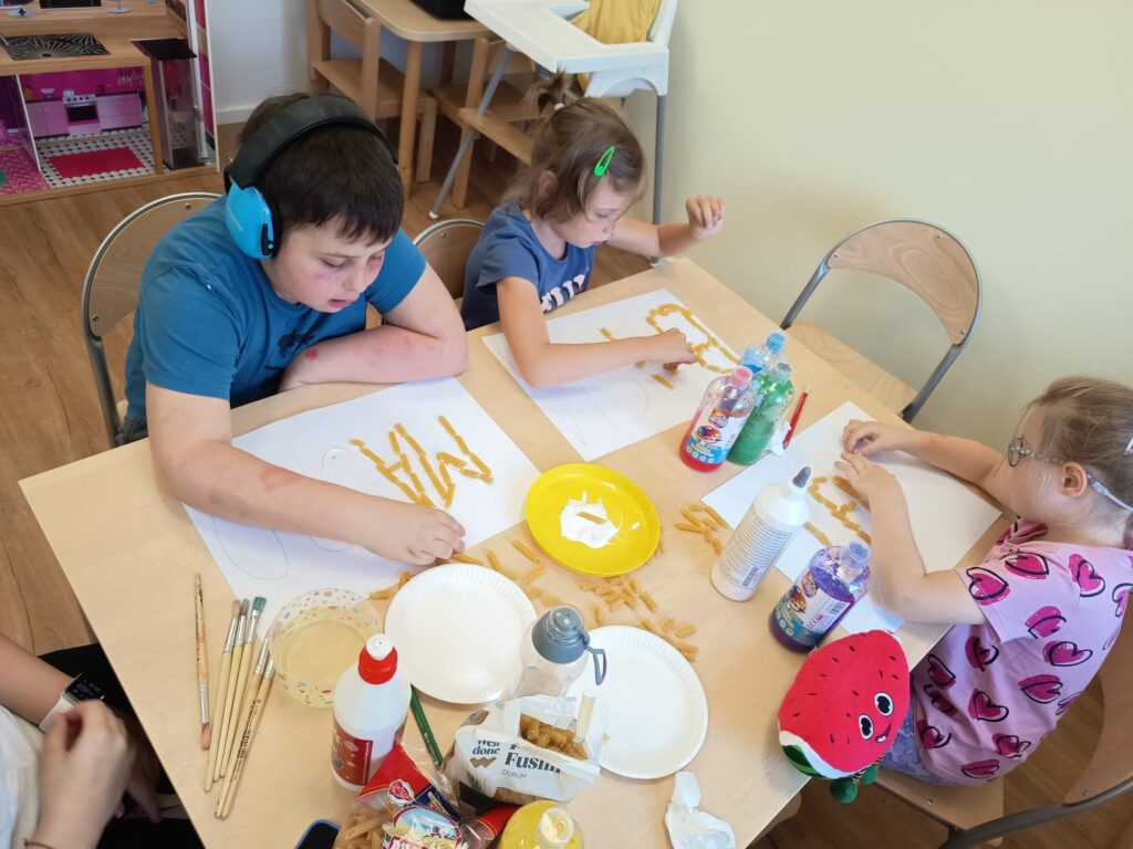 Arteterapia – malowanie burzy umożliwia dzieciom wyrażenie emocji. Po burzy dzieci stworzyły swoje makaronowe wizytówki.