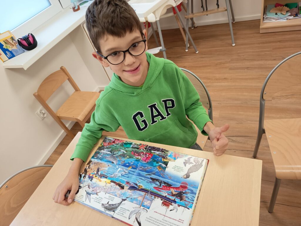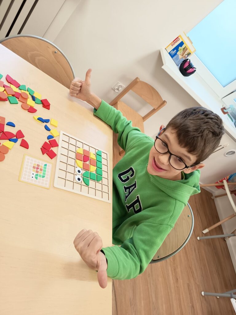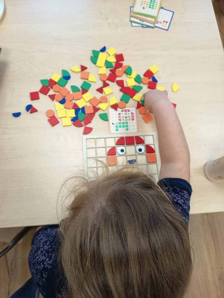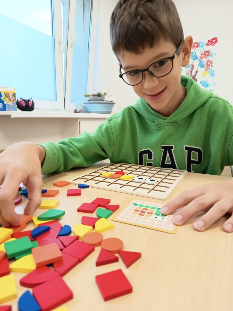 Terapia pedagogiczna, co tydzień nowe wyzwania. Ciocia Aurelia zaskakuje nowymi grami, układankami, do których dzieci układają historyjki, ćwiczą sylaby, powtarzają zdania.