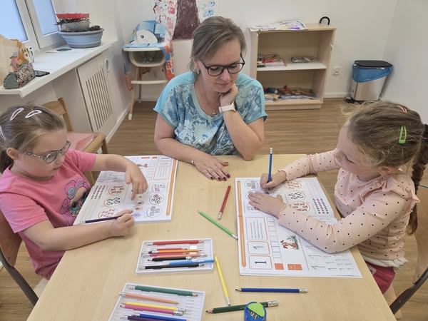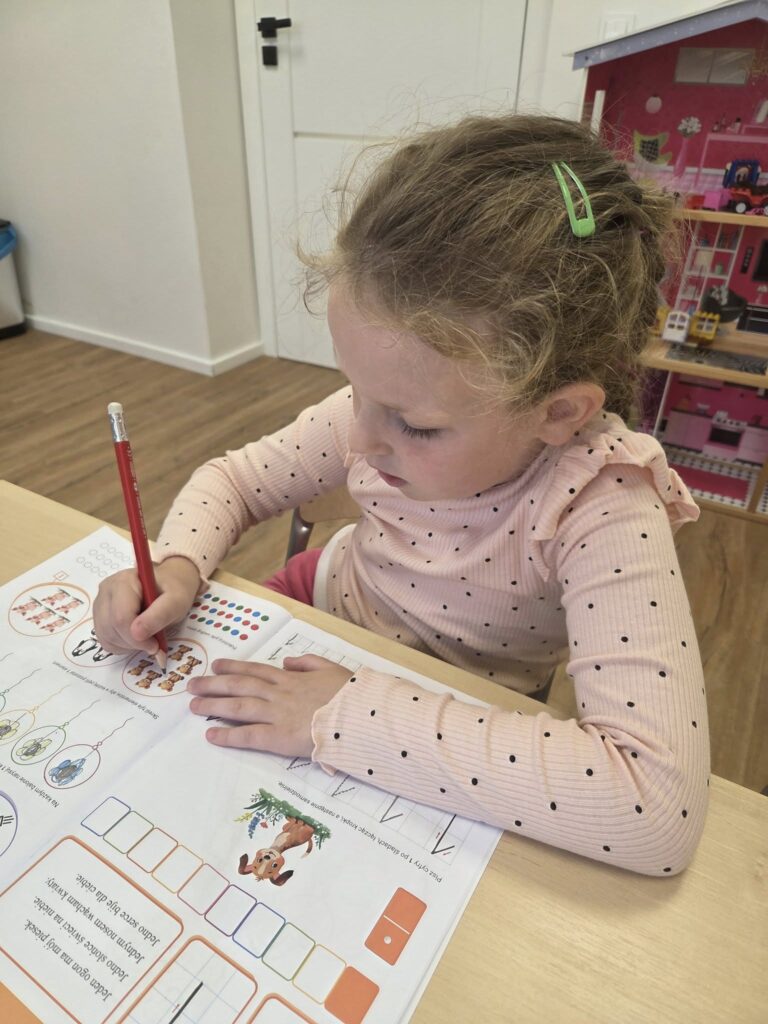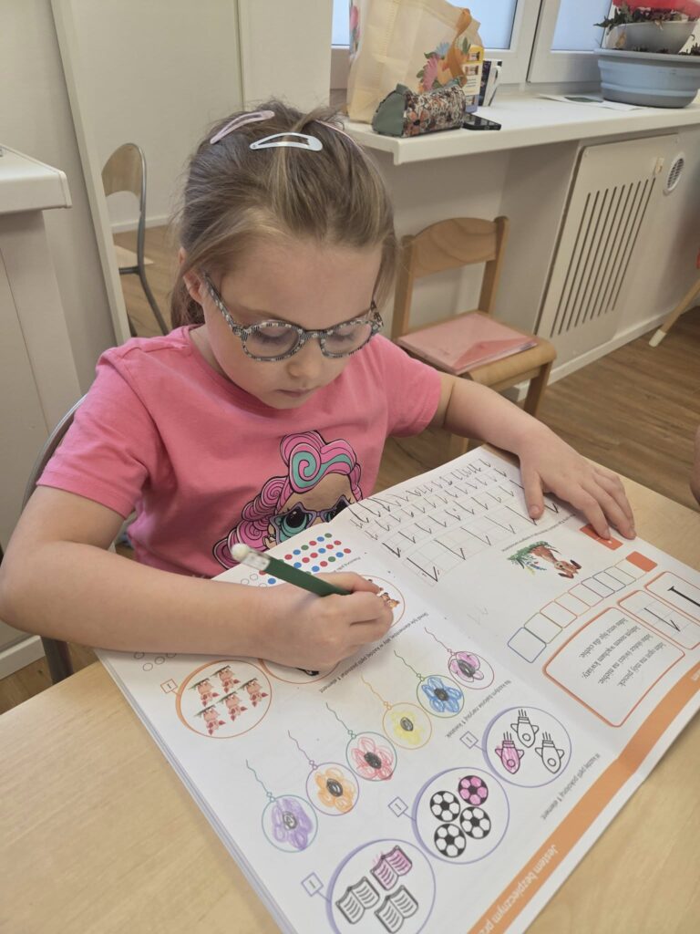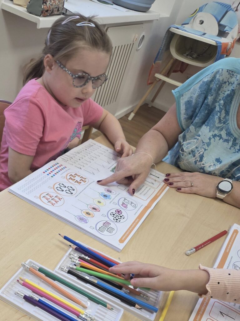 Każdego dnia dziewczynki ćwiczą pisanie literek, cyferek. Rozwiązują zadania na miarę swoich możliwości.